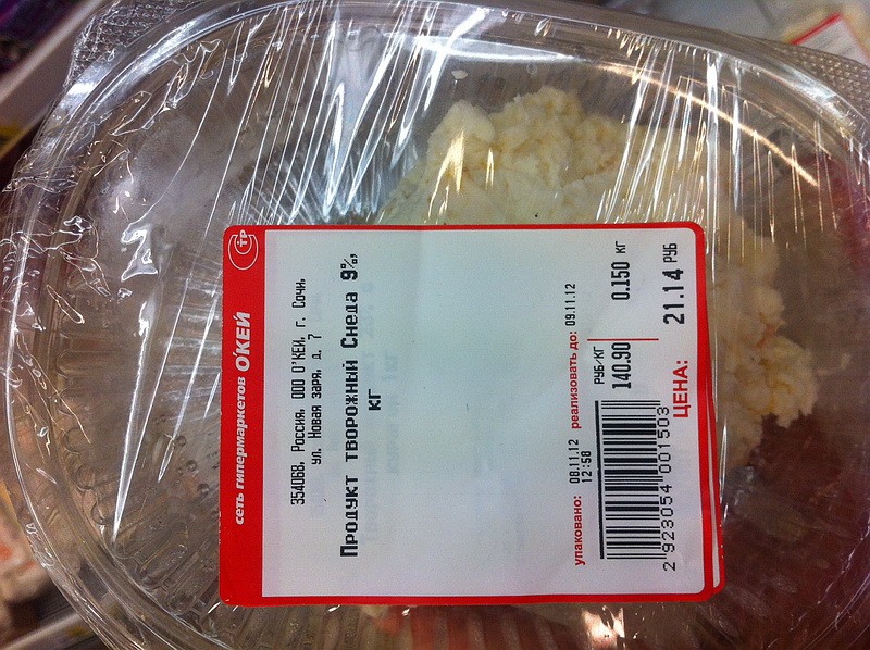 — что там с творожным продуктом и его сроками — не поняла, какие пару месяцев? но видно, что на верхней этикетке одно наименование — «продукт творожный Снеда», а на нижней просматривается другое — «творожный продукт с курагой», поэтому и цена другая. может, со сроками там и косяк, но причина, по которой наклеена новая этикетка, может быть и уважительной — прежняя неправильная;