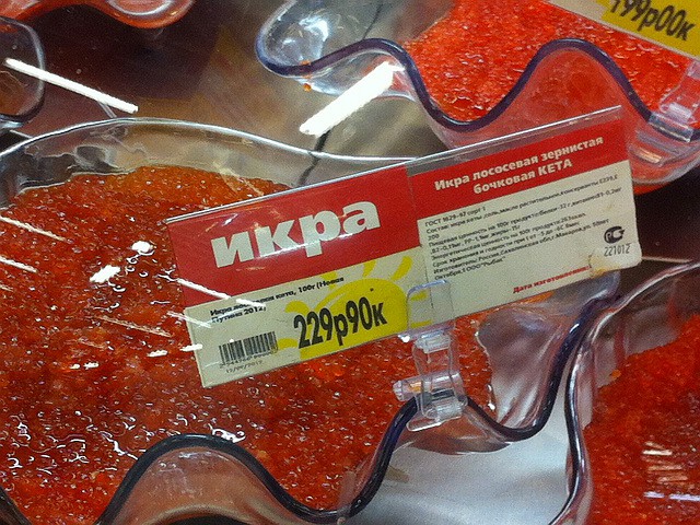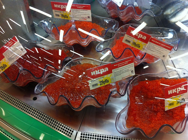 — икра красная «дата годности заклеена» — ну я не знаю… я может не туда смотрю, но вижу там только «дату изготовления», и она не заклеена, а наоборот — наклеена (сам ценник такой типа «постоянный» с глянцевым покрытием, а «дата изготовления» динамически меняется и набита этикет-пистолетом)