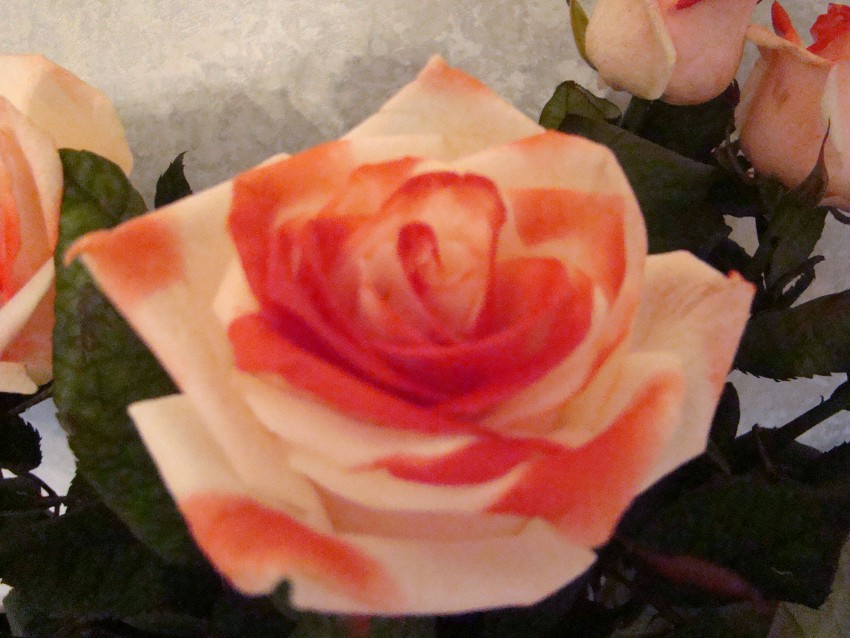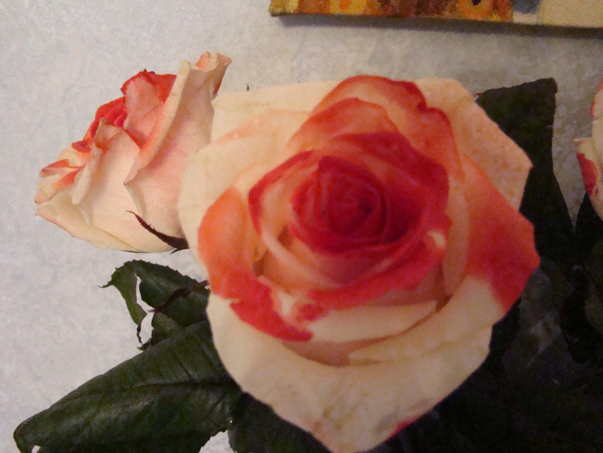 Сижу и чувствую запах (скорее, даже вонь!) краски. Короче, «благоухает» букет. Уже голова разболелась… Стала рассматривать цветы — розы ПОКРАШЕНЫ! Ну как в «Алисе в стране чудес», помните? Буквально, краской. При подробном рассмотрении увидела немного краски и на листиках, и маленькие подтёки на лепестках… А мужчина, покупая букет (по 150 руб за штуку, между прочим!), будет перебирать листики и лепесточки?