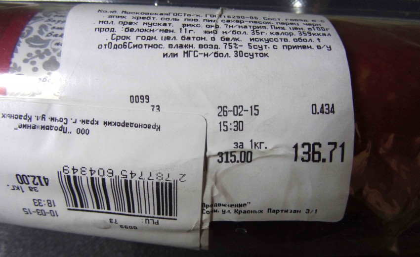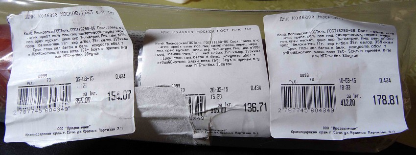 Сегодня мне довелось посетить недавно открытый в Хосте магазин «Пятёрочка» по адресу ул. Красных партизан 3/1. Зашел с задачей купить «приличной» колбасы на завтраки. Экспозиция предложенного товара этой категории была весьма скудна, но интересна. Подавляющее количество колбасных изделий в своем составе имели соевый белок, «хрящевую ткань», мясо птицы. Это в колбасах с названиями «Салями», «Говяжья» и прочие. Особое внимание привлекли батоны колбасы «Московская ГОСТ в/к». По составу все, как надо, но на каждом батоне имелось по несколько ценников наклеенных друг на друга слоями.