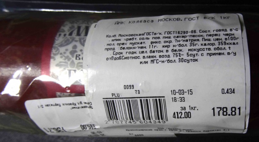 Самый нижний слой представлял ярлык производителя. Поскольку остальные наклейки в основном перекрывали доступ к информации о выпущенной продукции, узнать удалось лишь то, что колбаса выпущена в г. Батайске и упакована 20/02/15. Информация добыта путем просвечивания наклеек мощным источником света. Понятно, что покупателю в магазине сию тайну не узнать никогда.
