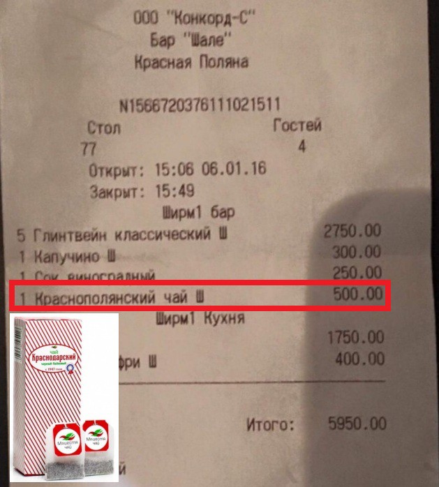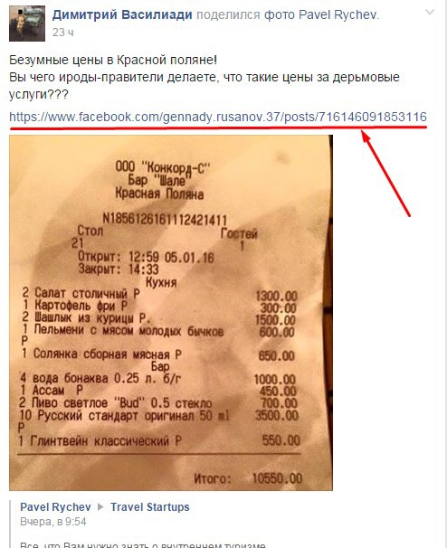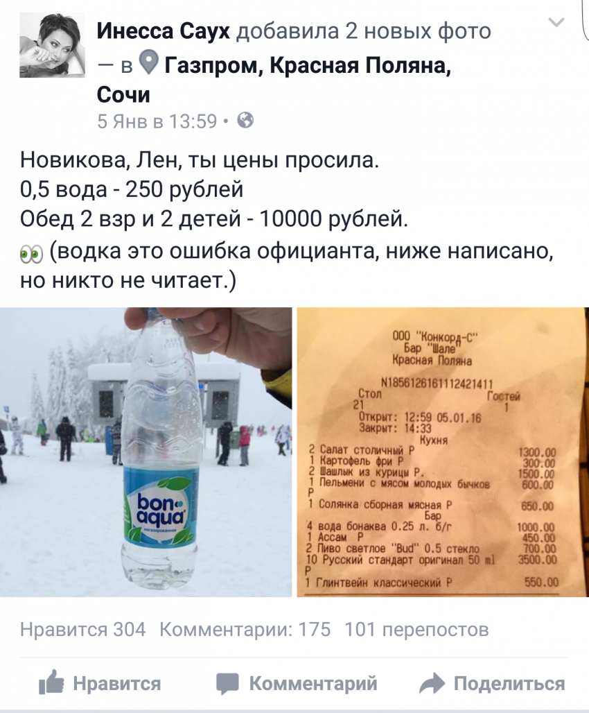 Сегодня в социальной сети Facebook одна из бурлящих тем, которая несколько раз уже попалась на глаза: фото чека из Красной Поляны за обед. Нашла автора. Туристы из Москвы, а именно некая Инесса Саух.