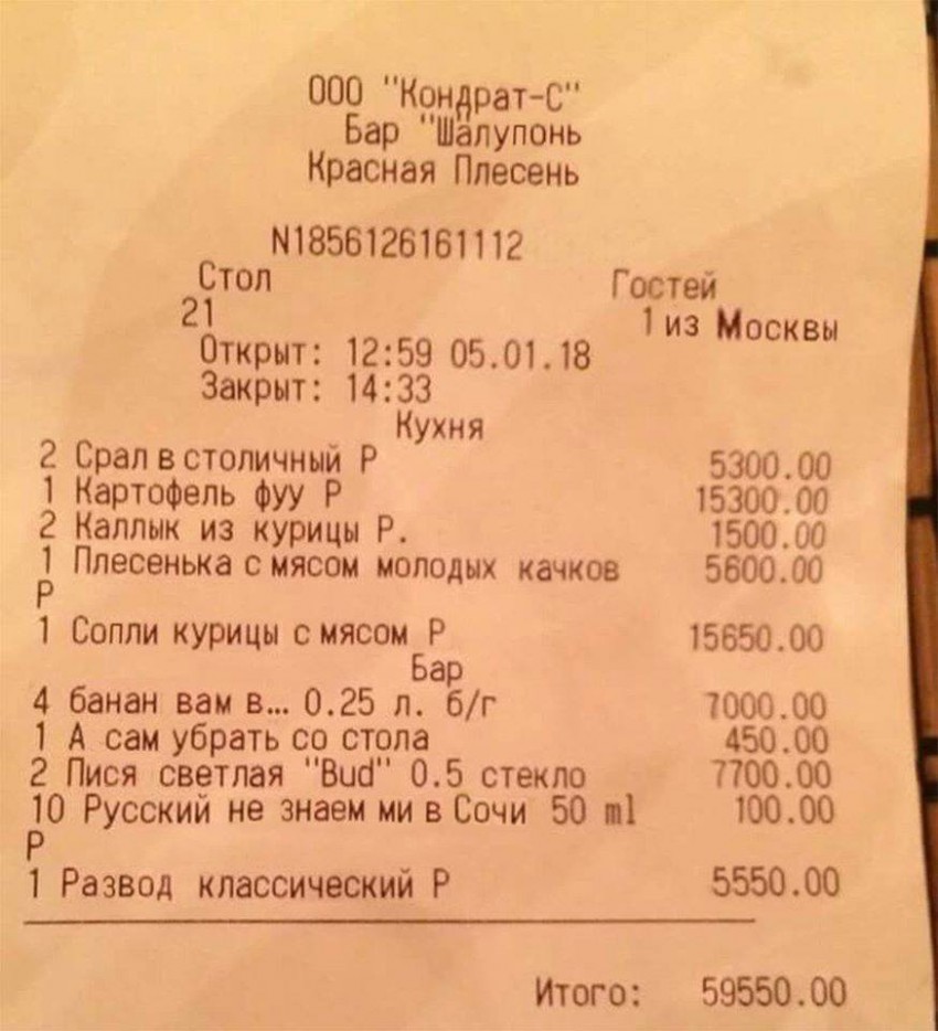 Не поступай как оппозиция — НЕ ВРИ. «Конский ценник» — это не значит, что вода стоит 1000 руб., а кофе 2000 руб, как оппозиция пытается впечатлить дураков фейковыми чеками. Не будь дураком — не верь оппозиции ;)