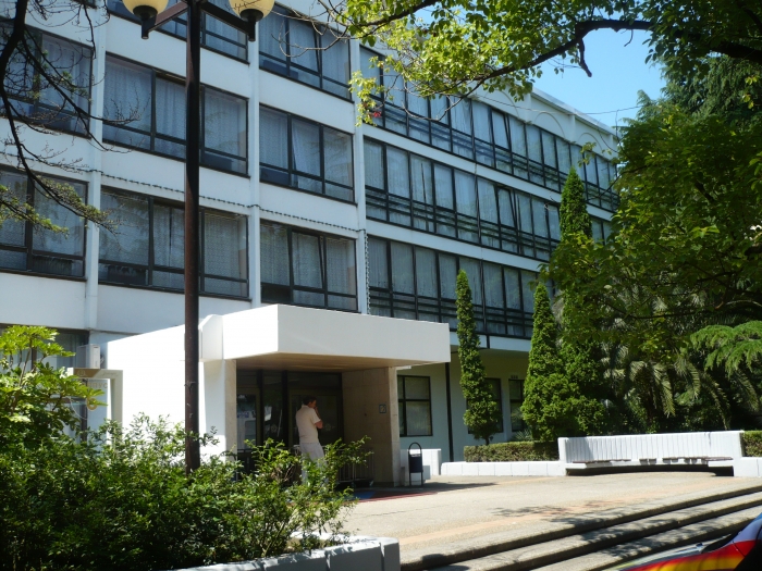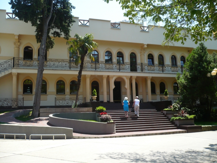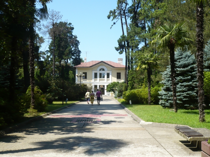 Информация о санатории с официального сайта, а это — парадный вход, где находится служба размещения. Здесь нас долго и мучительно пытали: куда и с какой целью мы идём, не отдыхать ли (под прикрытием), минут двадцать мы стояли у стойки, объясняясь со служащими. После того, как нам выписали пропуск, я всё же решила уточнить, а что будет, если мы придём сюда отдохнуть?