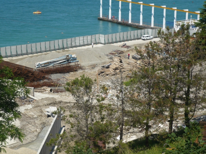 Чтобы отдыхающие и строители друг другу не мешали, к морю ведёт сложная система заборов и мостов — люди и техника не пересекаются