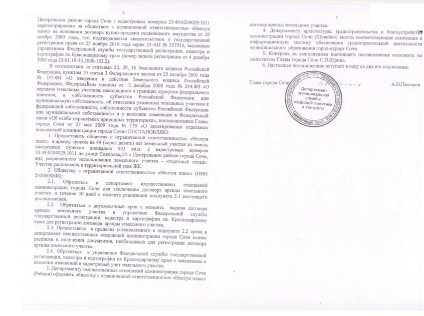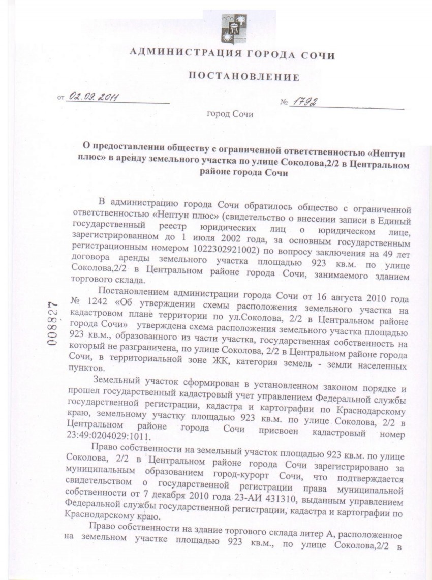 Тем не менее муниципалитет 02.09.2011 в отсутствие объекта недвижимости, земельный участок с зелеными насаждениями в территориальной зоне ЖК (зона гостиничного фонда)площадью 923 кв.м. сформировал для ООО „Нептун плюс“ с разрешенным видом использования „торговый склад“, передав его ООО бесплатно на 49 лет арены.