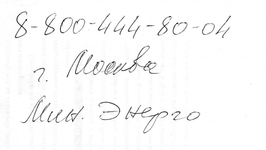 Так вот, подходит сегодня ко мне сосед. Дает бумажку, на ней телефон. Говорит по «Маяку» давали телефон горячей линии Мин Энерго. Просили звонить по всем проблемам, связанным с энергетикой.