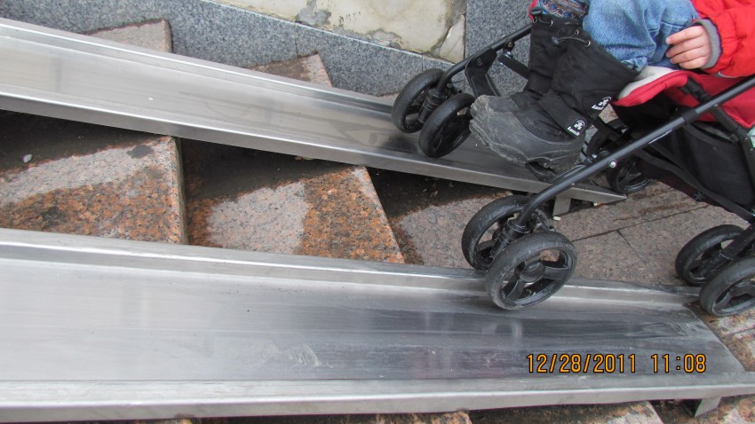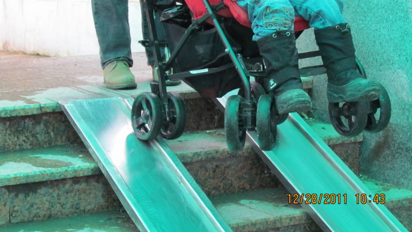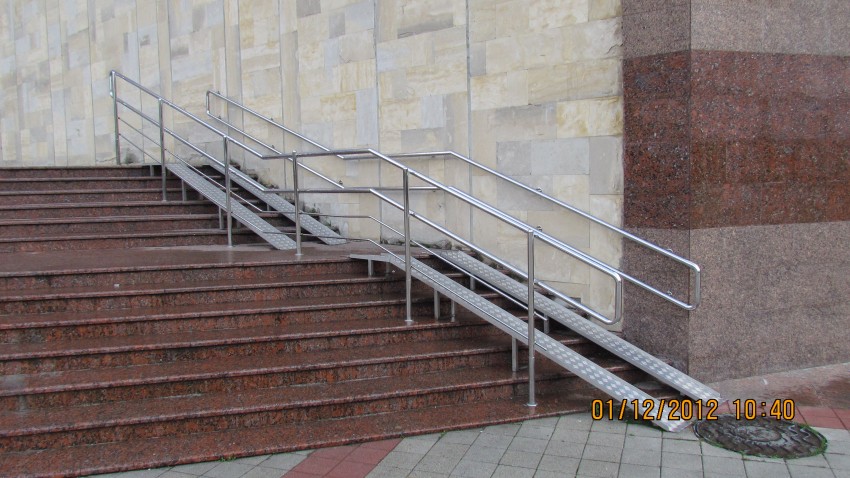 На практике большинство переходов и лестниц оборудовано рельсами, уклон которых равен уклону самой лестницы, что обычно составляет около 30%. Для инвалида-колясочника это слишком круто – на таком уклоне он может перевернуться.
