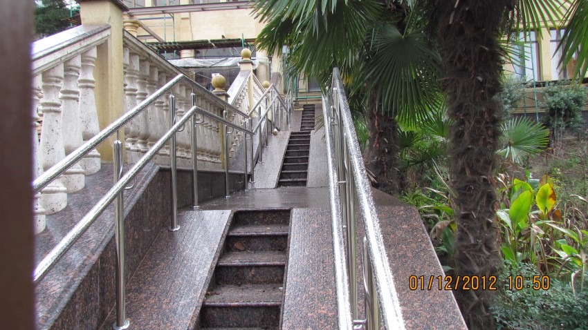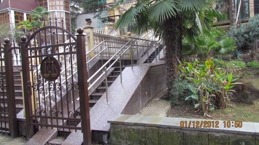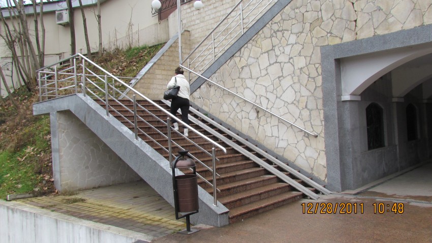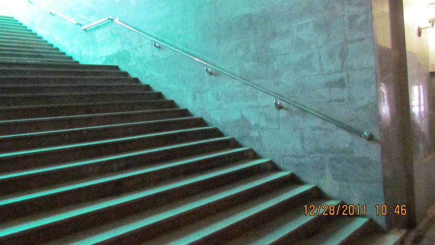 Возвращаясь к СНИПам: каждые восемь ступеней, при большом пролёте лестницы, должна обустраиваться площадка, лестница должна быть обустроена поручнями с двух сторон, (здесь один, да и то не с той стороны), ну, а конкретно, эта лестница — должна быть оборудована подъёмным механизмом, потому что, сами понимаете, сделать её пологой невозможно…