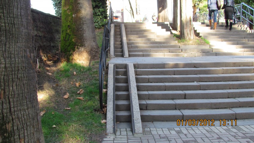 Когда я фотографировала эту очень крутую на подъём лестницу, подошла женщина с совсем маленьким ребёнком, она была одна и стояла растерянная, спрашивая, как ей здесь подняться и почему колёса коляски не встают, может она что-то не так делает…