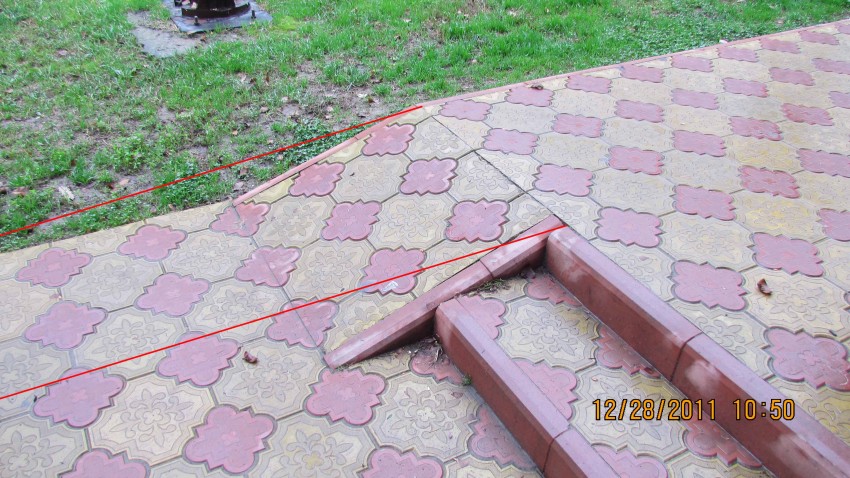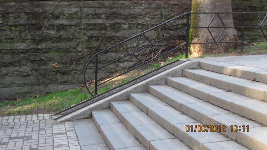 Да, ещё одно отступление… Моя дочь работает в крупной канадской фирме занимающейся ландшафным дизайном.Приоритетным направлением является городской ландшафт, т.е. проектирование пандусов — её хлеб… Дочь примерно прикинула (в двух вариантах, с захватом пандуса перехода на заднем плане), как должен был выглядеть наклон пандуса, с такой высотой ступеней