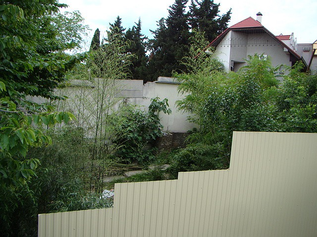 На этом фото вы видите два забора. Один бетонный показывает границы участка закрепленного за снесенными частными домами. Другой металлический проходит по городским землям, обозначая новый землеотвод под строительство.