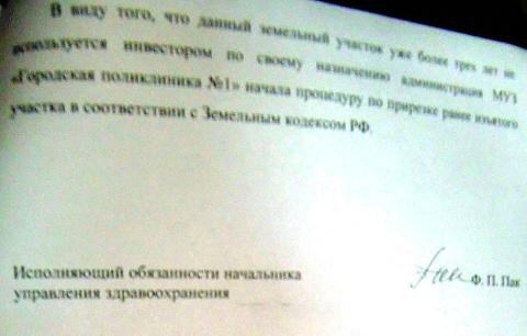 Городская поликлиника №1 начала процедуру по прирезке ранее изъятого участка в соответствии с Земельным кодексом РФ.Значит, изымали землю, как водится, без учета мнения обитателей поликлиники, а возвращать сами-сами-сами? Некрасиво получается.
