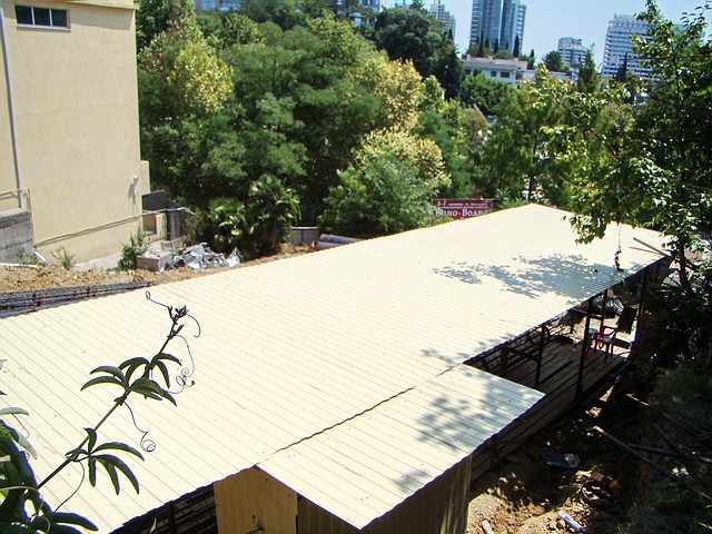 Судя по по построенному желтому объекту, с нависающими балконами над крышей похоже на то, что владельцы данного новостройки должны были до начала строительства отселить из барака проживающих там граждан и снести барак.