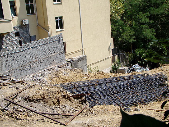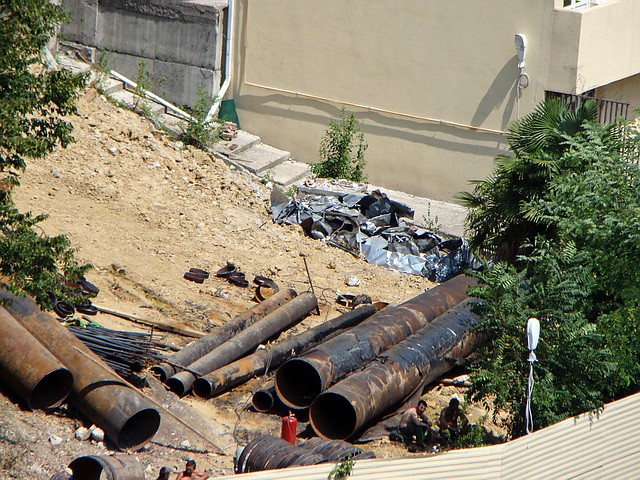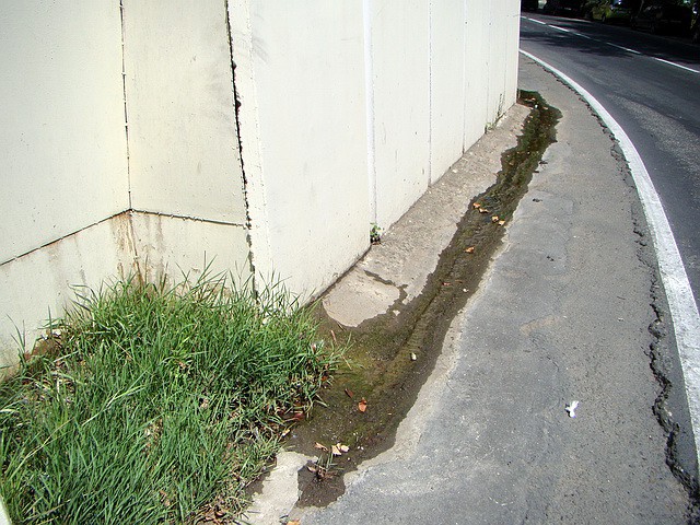 Вода камень точит. Подпорная стенка под будущим строительством явно протекает. Вода течет по дороге и соединяется с другим ручейком. Оба текут мимо решетки ливневой канализации, призванной принять эти потоки. Погоды стоят нынче жаркие, что здесь твориться в дождь неизвестно.