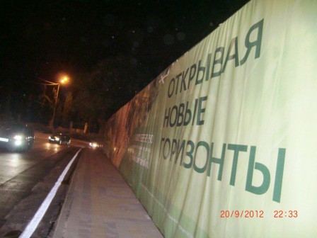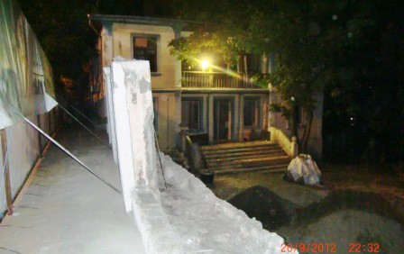 20 сентября 2012г. по ул. Москвина, 7 где находятся два памятника истории, культуры г. Сочи без опознавательных «знаков» о том кто делает, что делает и на основании каких разрешительных документов за баннером «Открывая новые горизонты» начаты строительно — разрушительные работы.
