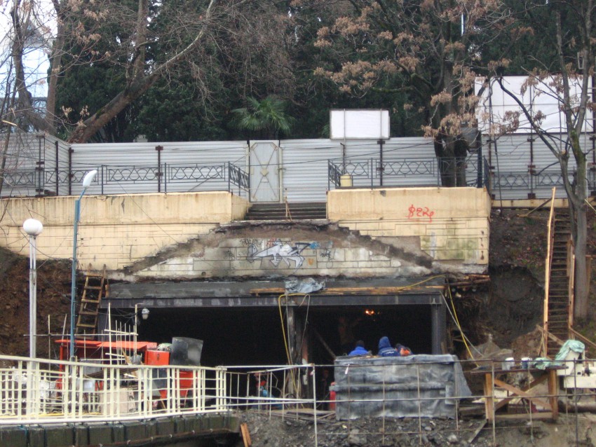 Воспользоваться им можно было, но аккуратно. Если смотреть со стороны реки, то его правая часть представляла поток воды. По левой удалось дойти до будки охранника и лифта. Снимки поганые, т.к. снимал почти в темноте, на ощупь.