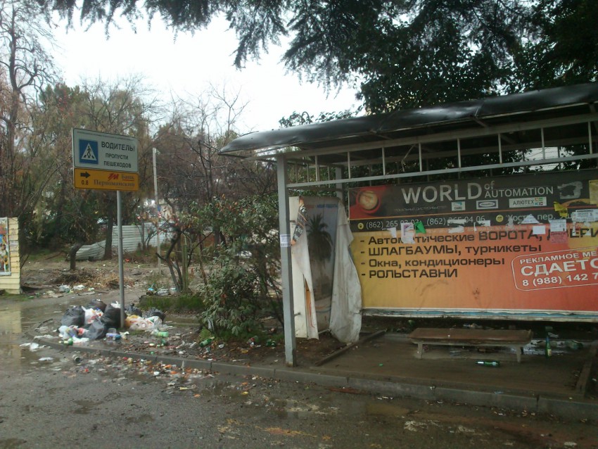 Автобусная остановка осталась на стройплощадке и превратилась в свалку. Теперь автобусы подбирают пассажиров посреди дороги, усложняя и без того затруднённое движение на этом участке.