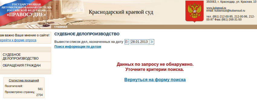 Может следует в прокуратуру чиркнуть. Пусть разберутся почему сайт краевого суда устроен так, что единственная мысль, которая приходит после поиска какой бы то ни было информации, что судейское сообщество умышленно занимается сокрытием информации.