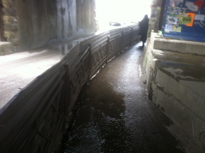 Вот уже больше недели в районе Ареды под строящейся эстакадой дублёра течет полноводный ручей. Ручей необычный, рукотворный. Течет он неутомимо, в любую погоду и время суток. Исток его находится где то за забором стройки эстакады, протекает он как раз в аккурат по пешеходной дорожке, где ходит много народа, дети в школу, взрослые на работу, по делам…