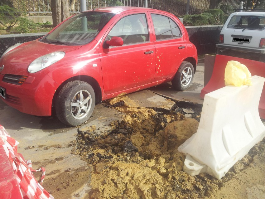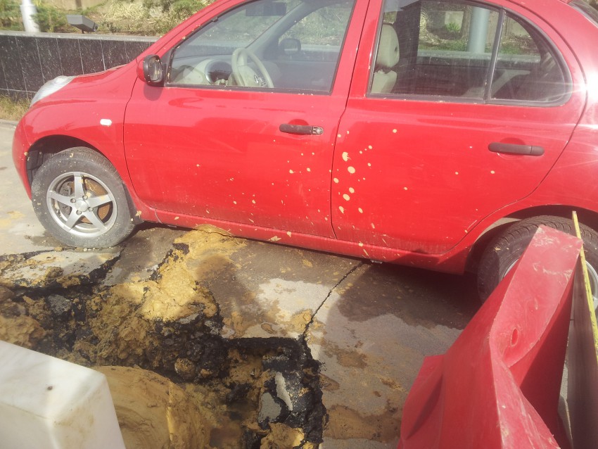 Досталось не только дорожному полотну, но и маленькой машинке, которая безпомощно повисла в воздухе.
