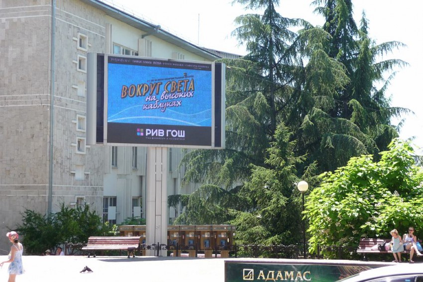 В 2006 году у меня появилась мысль установить большой экран в Лазаревском, но средств не было (дорогая игрушка), уговорил товарища на совместный бизнес, скинулись (50х50). Полгода топтал кабинеты чиновников и наконец-то разрешение получили. Заказали и оплатили доставку экрана, а параллельно начали подготовку к его установке (вырыли котлован, подвели кабеля управления, электричество, залили фундамент). Когда пришли модули самого экрана, начали заливку стаканов под трубы, заказали автокран, воткнули эти трубы в стаканы, залили бетон.