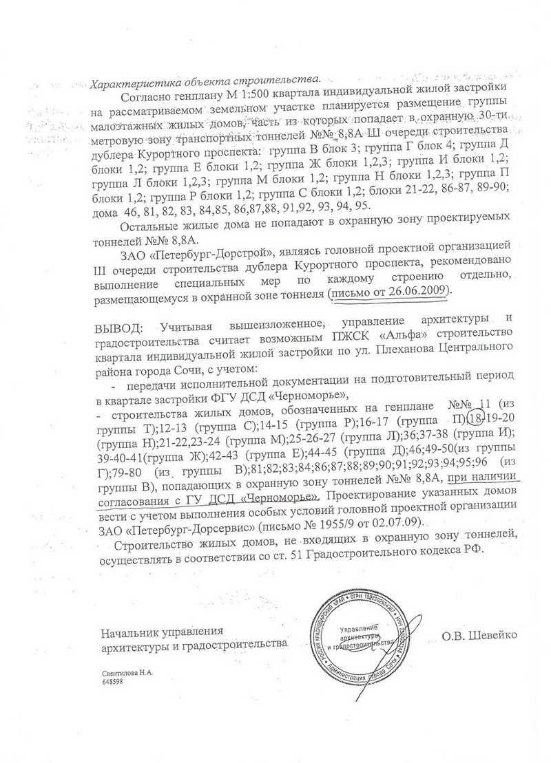 Далее в ЗАКЛЮЧЕНИИ ПЖСК «Альфа» было прямо указано на необходимость непосредственного согласования с ДСД «Черноморье» возможности строительства домовладений на ряде участков жилищно-строительного кооператива (включая участок №18) в границах охранной зоны строящихся тоннелей 8/8а Дублера Курортного проспекта, а проектирование этих домов – вести с учетом выполнения особых условий головной проектной организации.