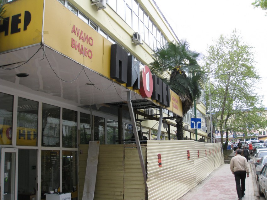 Магазин — склад «Пионер» на улице Юных Ленинцев". Клумба на его правой стороне, также зеленела, как эта, с левой стороны от входа. За день подкопали пальму, снесли газон. На другой день поставили забор, чтобы народ не видел, что творится и не мешал крысятничать.