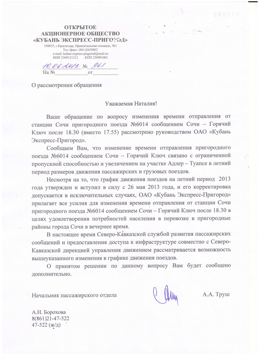 Уважаемая Ольга! Ваше обращение, поступившее в онлайн — приемную Главы города Сочи А.Н. Пахомова по вопросу недостаточного количества вагонов в пригородных поездах, курсирующих в вечернее время на участке Сочи-Туапсе, рассмотрено. ОАО «Кубань Экспресс-Пригород» осуществляет свою деятельность по перевозке пассажиров подвижным составом, арендуемым у Северо – Кавказской дирекции моторвагонного подвижного состава — структурного подразделения ОАО «РЖД» на основании ежемесячно подаваемого запроса на аренду транспорта. По сообщению Генерального директора ОАО «Кубань Экспресс-Пригород» пригородный поезд № 6014 сообщением «Сочи — Горячий Ключ», отправлением от станции Сочи в 17:55, прибытием на станцию Горячий ключ в 21:51, в соответствии с запросом на июль 2013 года заявлен в 10-ти вагонном исполнении. Так же, в 10-ти вагонном исполнении заявлен пригородный поезд № 6910 сообщением «Адлер-Туапсе», отправлением от станции Адлер в 18:26, Сочи 19:06-19:11, прибытием на станцию Туапсе в 21:57. ОАО «Кубань Экспресс-Пригород» неоднократно направляла письма с требованием обеспечить курсирование пригородных поездов в 10-ти вагонном исполнении. В соответствии с разъяснениями, поступившими от Северо-Кавказской дирекции моторвагонного подвижного состава, эксплуатация пригородных поездов в 10-ти вагонном исполнении не представляется возможной из-за недостаточной длины путей отстоя пригородных поездов в ремонтном локомотивном депо станции Туапсе; максимально возможная составность поездов составляет 9 вагонов. В настоящее время курсирование всех пригородных поездов на участке «Туапсе-Сочи-Адлер-Сочи-Туапсе» осуществляется 9-ти вагонными составами. На участке Сочи-Туапсе курсирует 7 пар пригородных поездов. Назначение дополнительных пригородных поездов сообщением «Сочи-Лоо» не предоставляется возможным ввиду ограниченной пропускной способности участка Туапсе-Адлер, интенсивного движения поездов дальнего следования и пропуска грузовых поездов к строящимся олимпийским объектам.