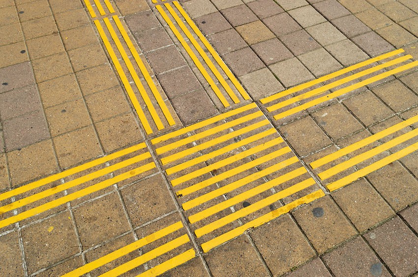 Поверх тротуара, на обычную плитку дорожной краской нанесли тактильные (2-3 мм высотой) ярко-желтые полоски.