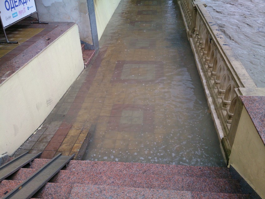 Ну и все это стекает к набережной реки «Сочи», где, как обычно, забыты стоки и создается обычная большая лужа.