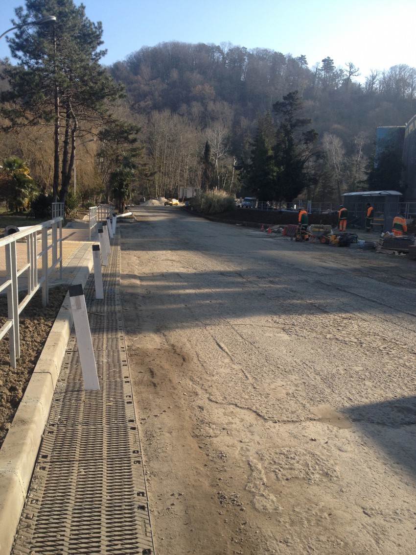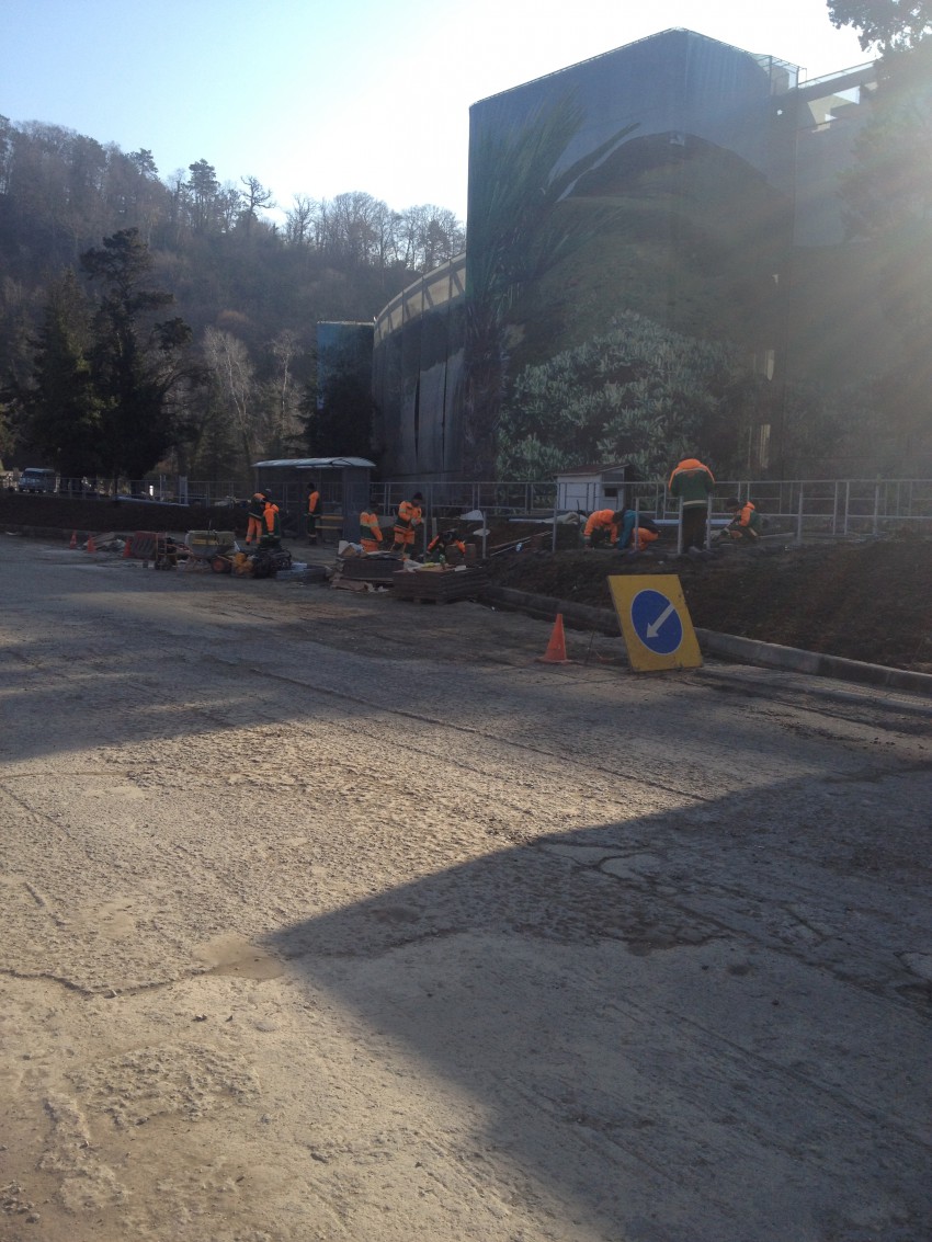Вчера днём проезжал мимо Мацесты и по случаю заехал за горячим лавашом, которые там продают напротив аквариума. Увидел интересную картину. Оборудуют остановки — не вдоль аллеи Челтенхема, а в сторону объездной. Видимо скоро здесь будет проходить маршрут общественного транспорта, только пока не представляю как и какой. Заканчивают укладку тротуаров и ливневок. Ну и готовятся к озеленению. С одной стороны хорошо, просторно, культурно. С другой на территории ярмарки парковка автомобилей и таксистов. Ну и не понятно… Дорога от виадука станет двустронней?