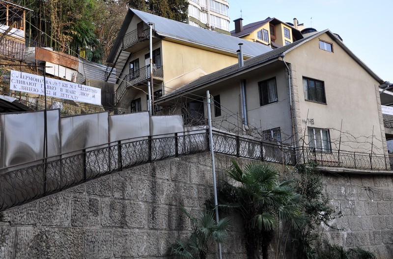 Историческая справка: в 1994г. Ракловым приобретён участок площадью 394 кв.м., в 2010г. к нему при межевании добавлено 299 кв.м., фактически огорожено и используется Ракловыми 979 кв.м. Это цифры из официальных судебных документов. А плакат нужен чтобы отвлечь внимание от главного- наглого отъёма земли в центре Сочи.