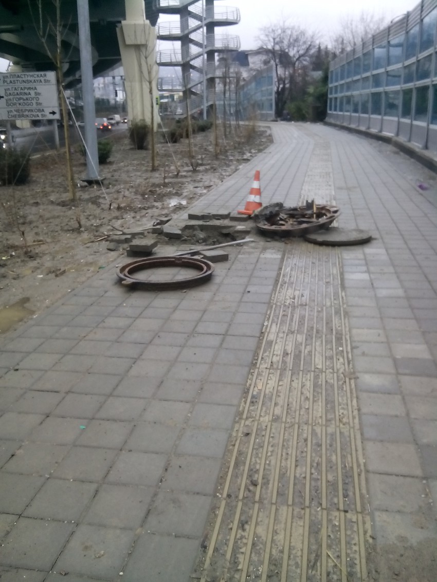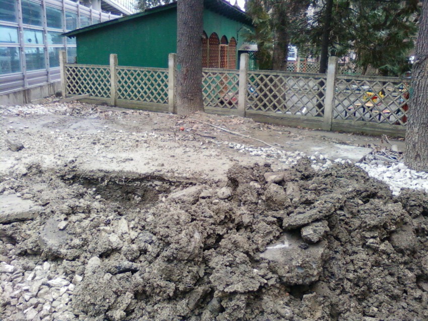 А если спуститься с Горького к ярмарке на Ю. Ленинцев — там площадка перед воротами в ярмарку так и брошена… трубы закопали, булыжниками всё засыпали — добро пожаловать все, кто желает ножки поломать…
