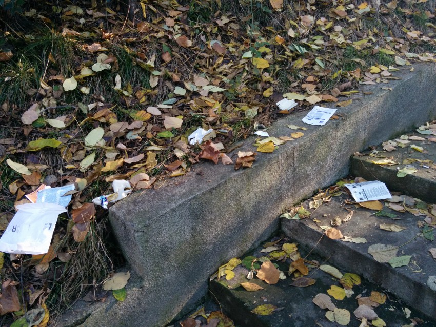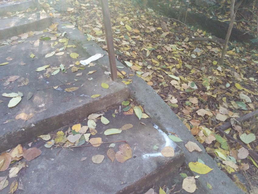 Здесь даже днём очень редко ходят люди. Местечко, скажем прямо, глуховатое, и ночью сюда лучше не соваться, хотя это существенно может сократить путь к вокзалу. И я ни разу не видела, чтобы здесь убирали. Но! Тем приятнее было сегодня здесь пройти: после всех дождей и с учётом осени и множества деревьев, на лестнице — чистота и ни единого листика!