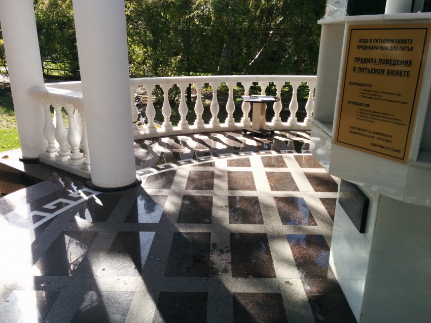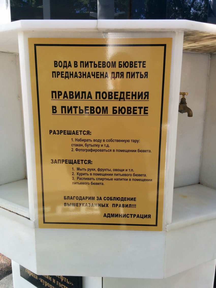 Хотела не просто уйти, а убежать. Но я ж приехала попробовать воду. Купила-таки стакан, выпила воды. Вода — супер! Действительно вкусная! Думала, что будет просто из-под крана — при таком-то сервисе. Ничего подобного: никакая не водопроводная, чувствуется особый привкус, напомнивший один из нарзанов в Поляне (те, что после поста погранцов), но мягче и без пузырьков газа. Отличная вода!
