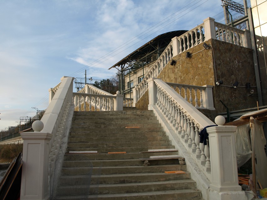 В прошлом топе я рассказал о псевдомраморной лестнице, упершейся в решетки РЖД со стороны Курортного и не стал упоминать о новой лестнице со стороны моря, упирающейся опять же в постоянно закрытую решетку с дверью. Тогда не было возможности подойти к ней — стройка в разгаре. Сейчас немного расскажу и о той, что сверху — тоже будет. Там оперативно прибрались.