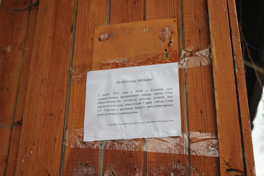 На зданиях висит объявление от таком сносе. Люди все еще там живут. Даже есть новые окна.