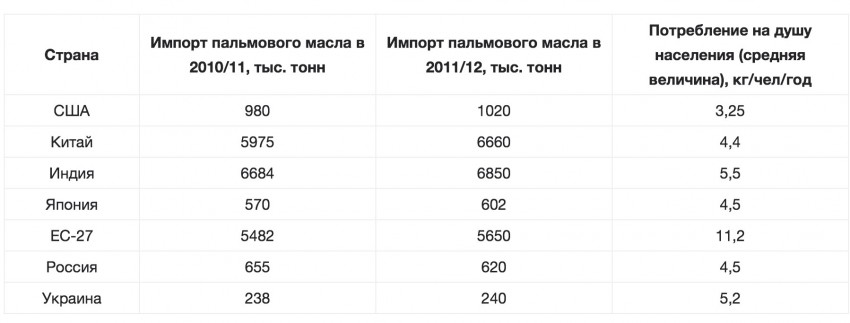 Давайте я вас немного просвещу. Итак, вот таблица импорта пальмового масла. И что мы видим? Россияне употребляют, в расчете на одного человека, столько же пальмового масла, сколько и небедные японцы. А европейцы вообще съедают в год 11,2 кг на человека, против российских 4,5 кг. Пендосы съедают меньше, но тоже прилично.