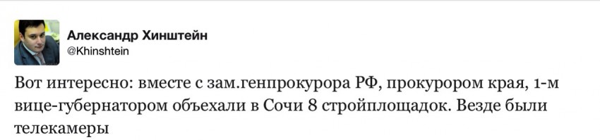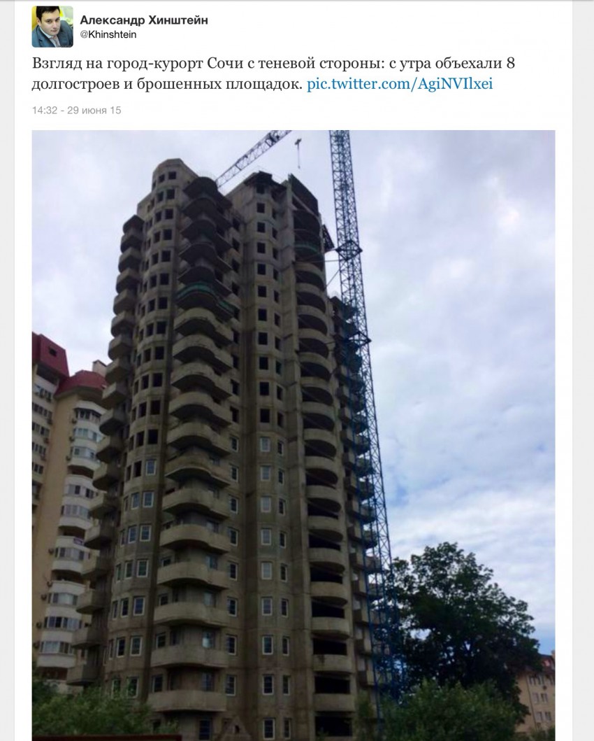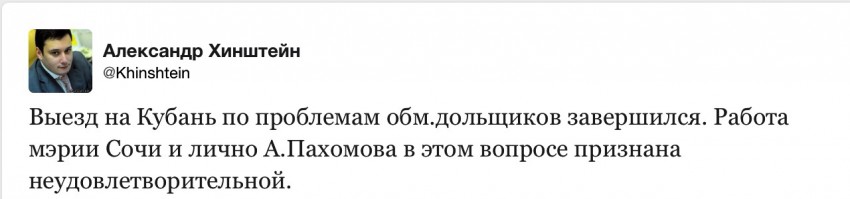Больше половины всех проблемных объектов в городе Краснодаре в этом году будут сданы, в этом нет никаких сомнений. Мы видели сегодня документы и видеофиксацию этих объектов. Три в городе Сочи, четыре в Анапе, — рассказал Депутат Государственной Думы РФ Александр Хинштейн.