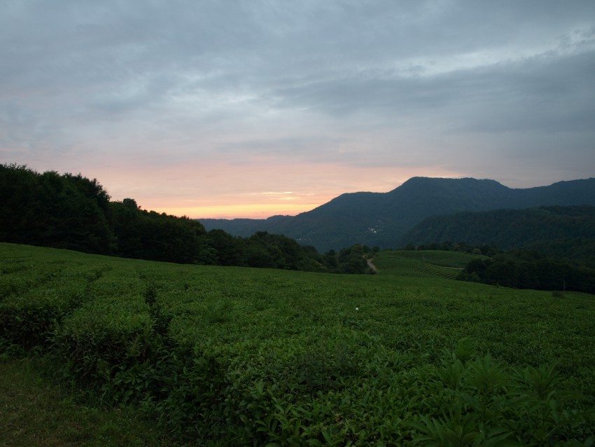 Говорят, мацестинский чай можно купить во всех гиперах страны. Менеджеров работа, видимо) И напоследок — еще немного чайной романтики. Один из жителей надоумил попробовать сделать чай самому — «просто высушить в тени. Давно хотел попробовать и забрался следующим вечером, на закате на одну из полузаброшенных плантаций. Надергал приличную горсть тех самых » двух верхних листочков", попутно любуясь видами плантаций, хребта Алек и почти родного Пикета.