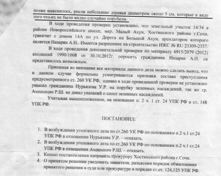 7. 17 ноября 2014 года был получен ответ на заявление в Хостинскую прокуратуру о проверке законности стройки и документации. Обращение было перенаправлено в Администрацию Сочи, а именно главе Пахомову А.Н., хотя в ФЗ « О Прокуратуре», ст10, ч.5 сказано: «Запрещается пересылка жалобы в орган или должностному лицу, решения либо действия которых обжалуются».