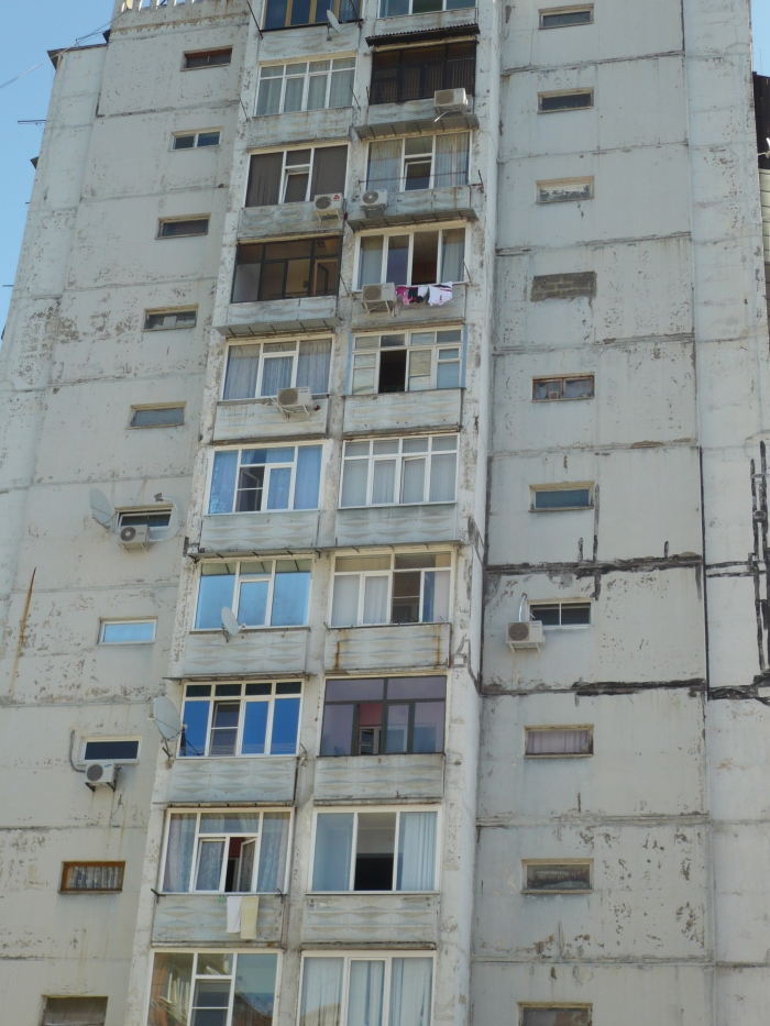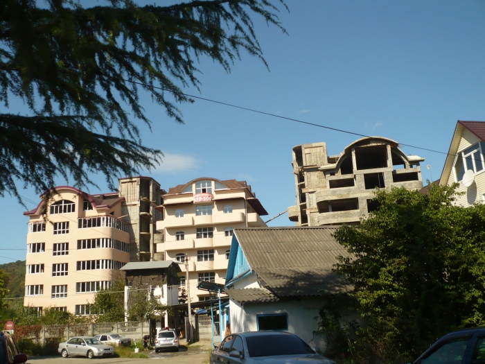 Проходя по центру Дагомыса, в основном по Батумскому шоссе и ул. Гайдара, я видела многоэтажные дома разной этажности, однако, не видела НИ ОДНОГО дома в строительных лесах, таких какие мы привыкли видеть в Центральном, Хостинском и Адлерском районах. Таких домов там просто нет! Хотя фасады домов удручают: