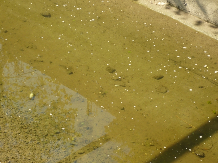 Как видно из исторической справки, в Дагомысе есть две реки — Западный и Восточный Дагомыс, за одну реку ничего не скажу — не видела, а одна река — да, есть. Правда, поскольку отсутствует табличка с названием, то для меня осталось тайной, какой Дагомыс Западный или Восточный я пересекла по мосту. С моста видно, что несмотря на то что вчера был довольно сильный дождь воды в реке мало, она какая-то подозрительно стоячая, однако, что интересно — в ней очень много мелких рыбок, на фотографии, если приглядеться, их довольно отчетливо видно: