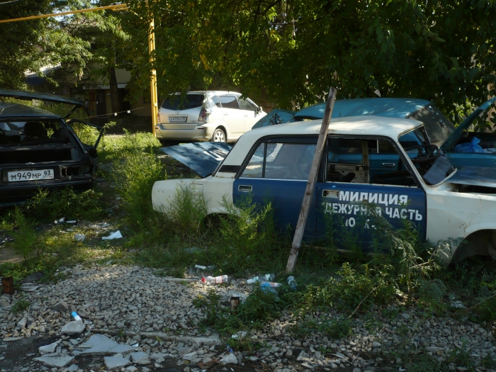Здесь же прямо возле РОВД, создано импровизированное кладбище автомобилей: