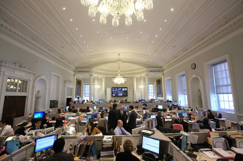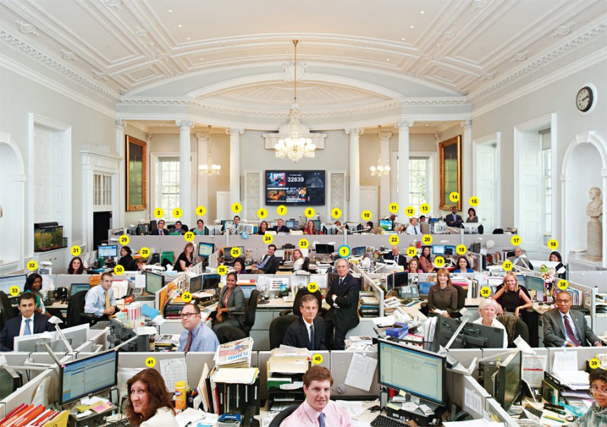 А вот общий вид рабочего кабинета, откуда Блумберг и его помощники управляют гигантским городом (бюджет в 2013 — 70 миллиардов долларов). Это место называется bullpen.