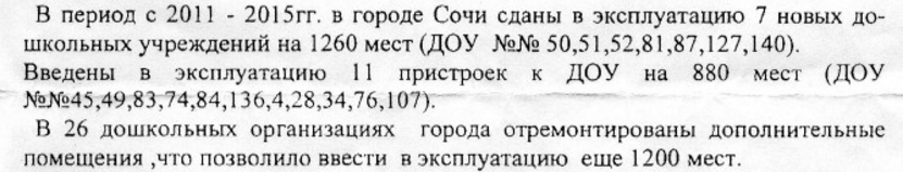 В 1-ом номере газеты «Курортная неделя» за 8 января 2016 года была напечатана статья общественника, бывшего Депутата Городского собрания Сочи Юрия Алексеевича Медведева «Кому выгодна ложь ?» о том, что в Сочи ликвидирована очередь в детские сады. Все сочинцы только порадовались этому!!!