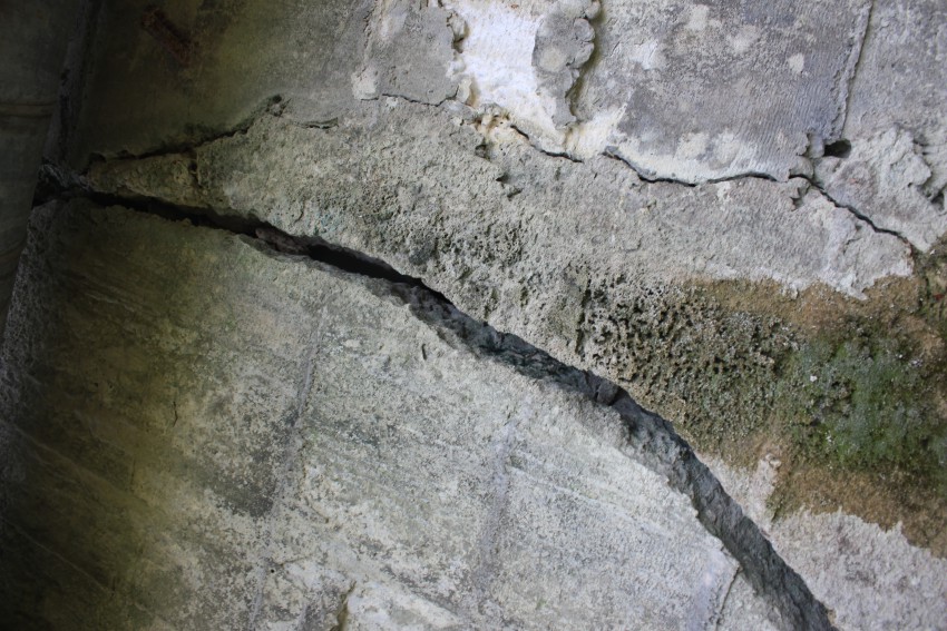 Таких трещин в стене — две, причём обе, от технологических разрывов. Трещины — полбеды, страшнее то, что насыпной грунт деформировал полотно стены так, что проходящие по стене трубы, в одном месте со стеной уже соприкасаются.