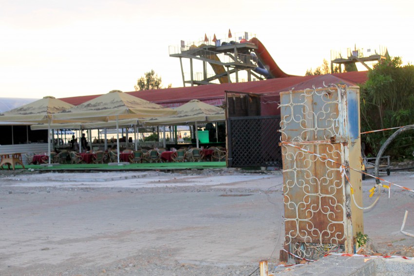 Вот и известный аква-парк «Маяк» про который было много споров в СМИ. Его планировали снести до первого июня. Парк закрывает море и расположен на муниципальной земле, так объяснял мэр города. Снесена половина аква-парка, оставшуюся часть собираются сносить после 30 октября. До 25 июня собирались снести ресторан «Фрегат» и белые ларьки напротив к/з «Фестивальный». Похоже, что ресторан «Фрегат» только подготовили к сносу. Напротив к/з «Фестивальный» стоят две белые палатки, рядом следы от трех стоявших рядом палаток. В соответствии с распоряжением №91р и №92р мэрия планирует снести 35 объектов вокруг аква-парка «Маяк». Напротив железнодорожного вокзала палатки из сквера сносили три года. Считаю, эти 35 объектов будут сносить гораздо дольше. В лучшем случае снесут половину.
