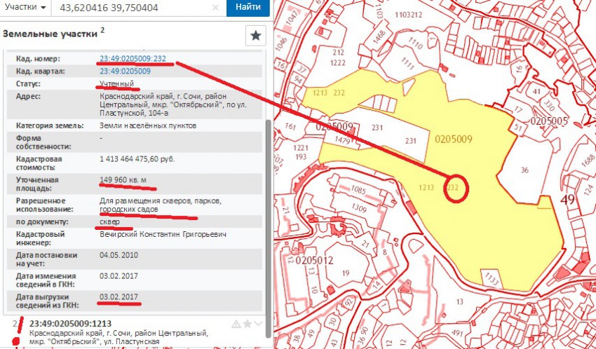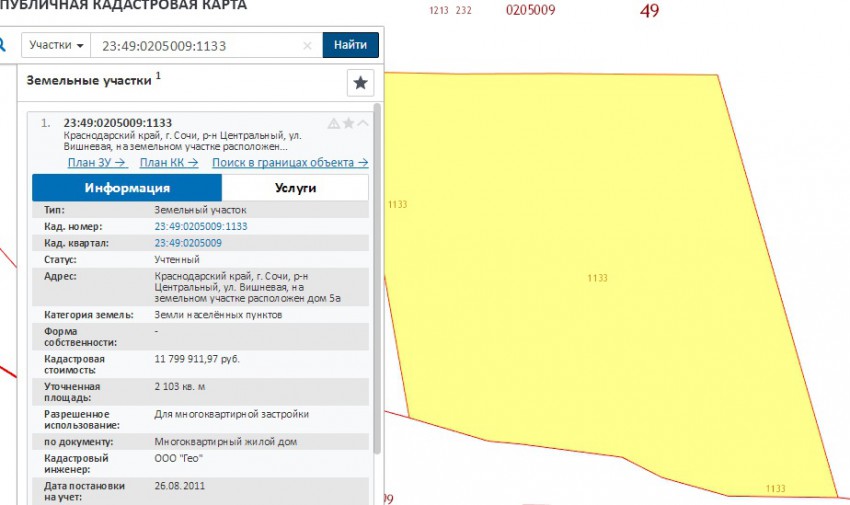 Один и тот же участок с выгрызом (к/нс 23:49:0205009:1133, указанном в разрешении на строительство) идентичной площадью и конфигурации, но с разным кадастровым номером, разрешенным использованием: